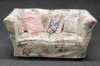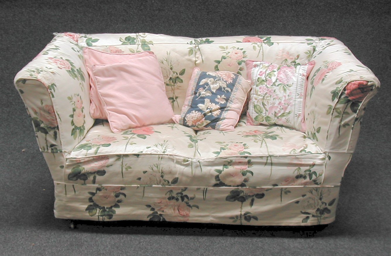 with splayed arms and back, original worn silk upholstery and tassels, turned mahogany front feet and castors, includes satin chintz loose cover