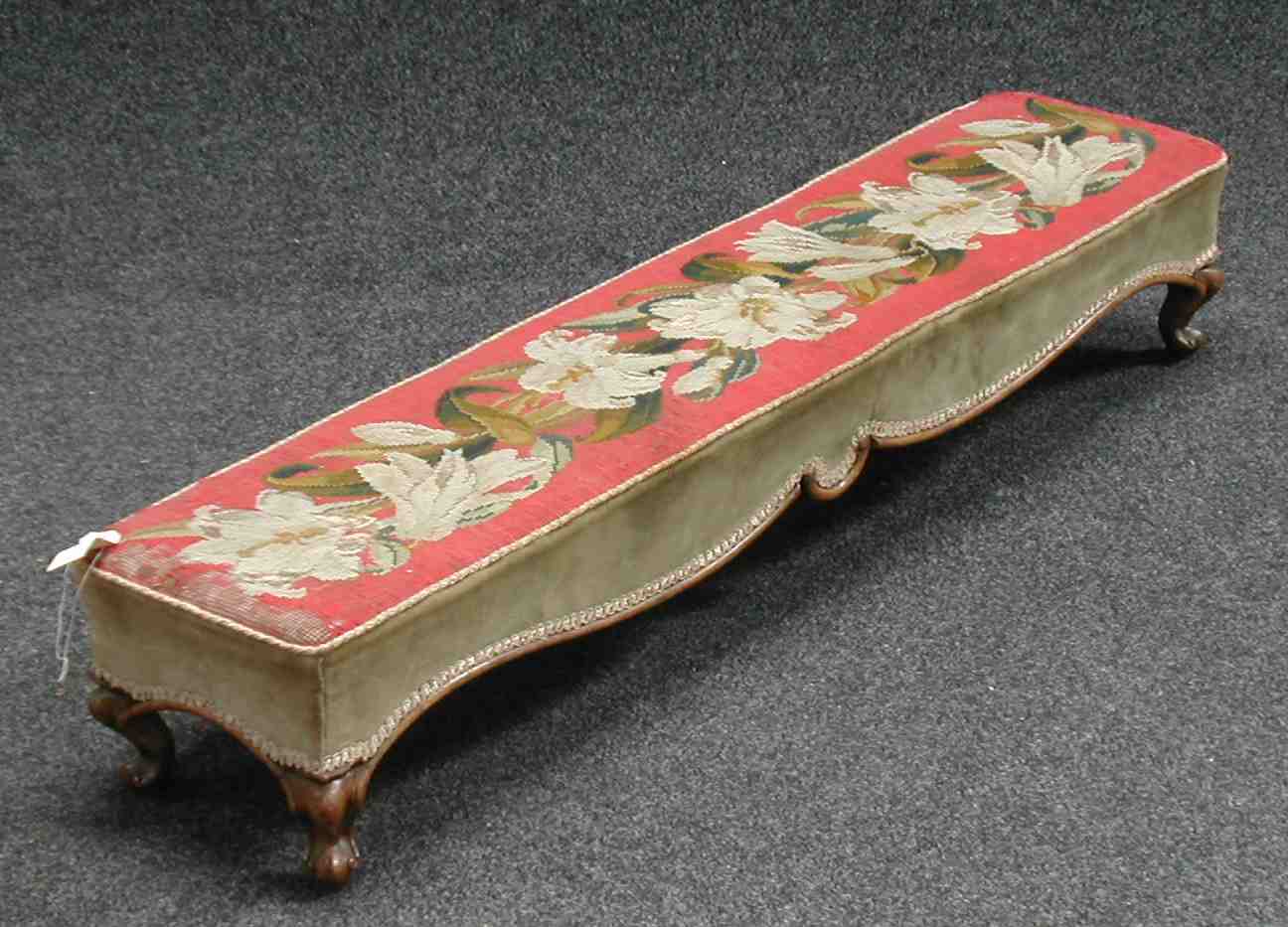 of rectangular form with gros point woolwork top of lilies with velvet sides, curvilinear moulded frame with scroll feet