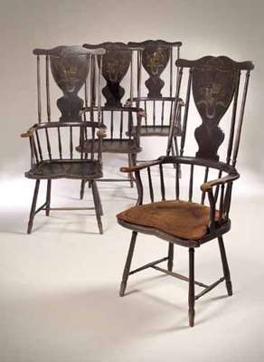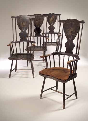 each with shaped top rail above vase splat painted with ribbon tied husk swags framing coat of arms of Graham of Gartmore, flanked by four turned supports, outscrolled ash arms with further turned supports and saddle seat, on splayed turned legs joined by H-stretcher; the splats badly wormed (4)