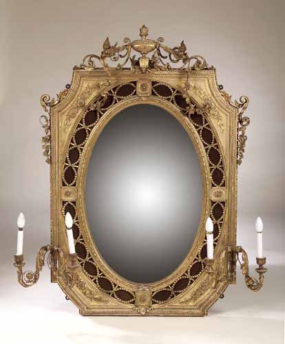 the oval plate within rectangular frame with curved canted angles, neo-Classical husk, guilloche and grotesque decoration and inset velvet border, surmounted by urn and doves, with pair of sconces having twin scrolling branches