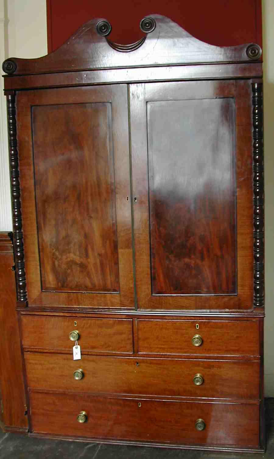 the cornice with swan neck pediment decorated with applied rosettes, above twin panelled doors enclosing hanging space above two short over two long drawers