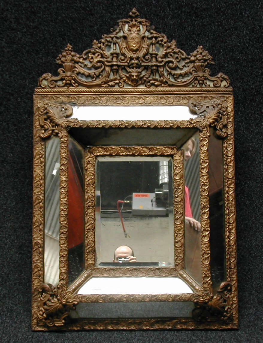 with giltmetal mounts, the bevelled rectangular central plate framed by subsidiary plates, scrolling mirror backed cresting