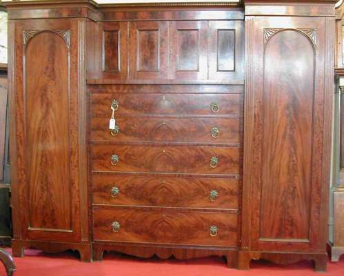 the reverse breakfront dentilled cornice above pair of full length panelled doors enclosing hanging space and flanking chest of five long graduated drawers with small recessed cupboard above, shaped apron and bracket feet