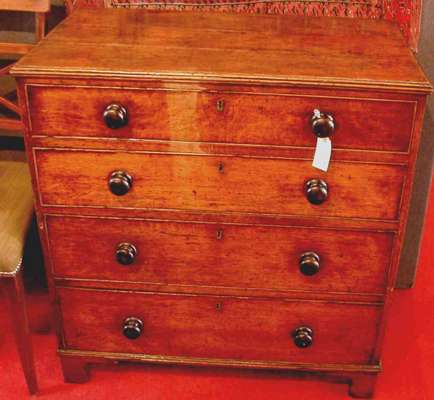 the rectangular top with moulded edge above four long graduated drawers with turned ebonised handles and bracket feet