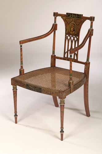 the square back with waisted splat pierced with entwined Gothic tracery and painted to the toprail en grisaille with putti above a roundel painted with a mother and child, the downswept arms above caned seat and turned and tapering legs, all painted with flowers and foliage