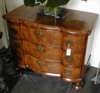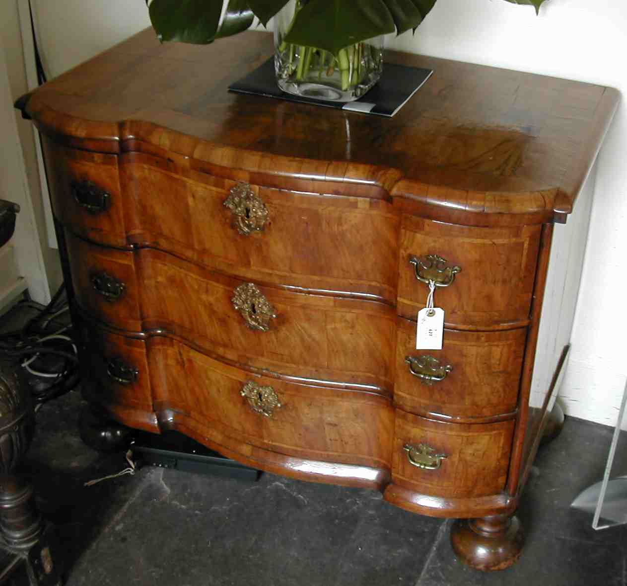 of small proportions, the crossbanded top with moulded edge above serpentine shaped front of three graduated and crossbanded drawers, raised on later bun feet