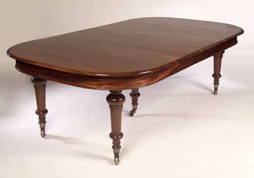 the rectangular top with D-ends and rounded edge above plain frieze, raised on turned and buckle carved tapering legs with brass caps and castors, the telescopic pull out action with further matching central leg, six extra leaves with frieze to each leaf