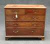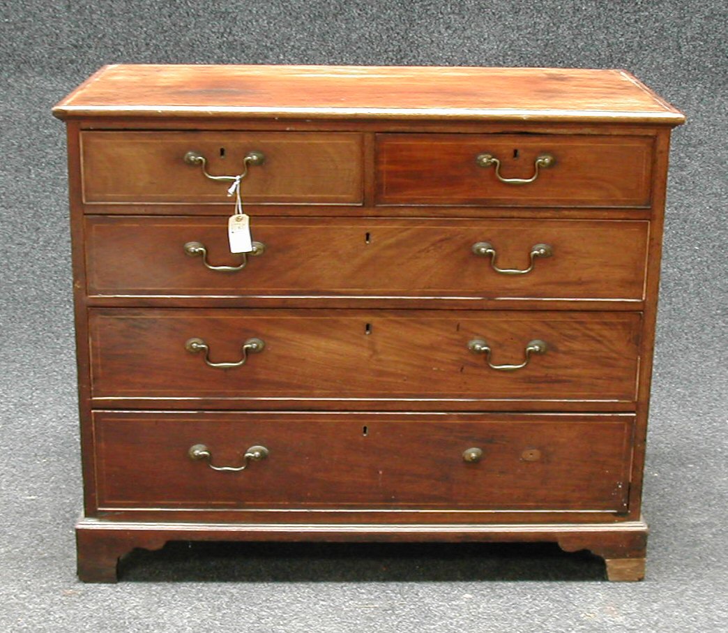 with boxwood stringing, the rectangular top with moulded edge above two short and three long graduated drawers, on shaped bracket feet