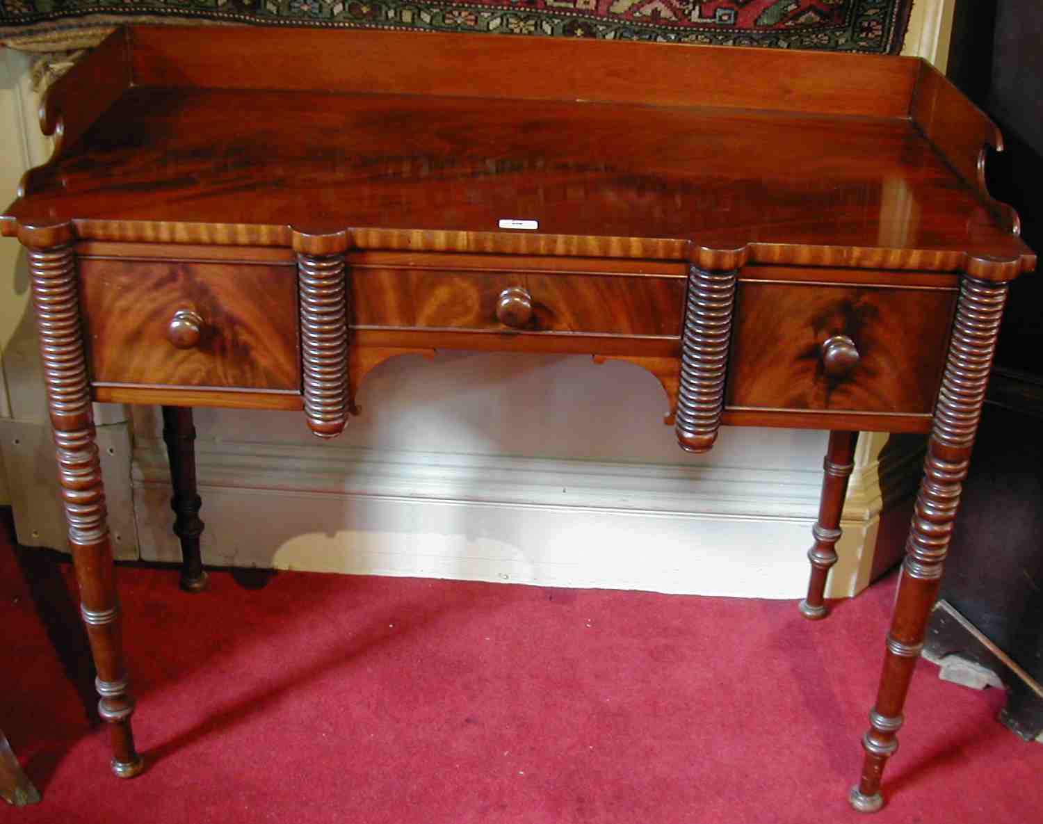the rectangular top with three quarter gallery above three drawers surrounding a kneehole and divided by bobbin turned pilasters, the whole raised on ring-turned tapering legs