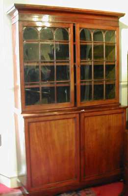 the ogee cornice above pair of astragal glazed doors enclosing adjustable shelves, on deeper base with pair of panelled doors enclosing shelves, plinth with flattened bun feet