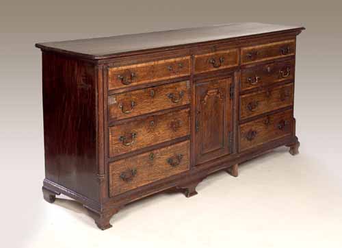 the rectangular hinged top with ogee moulded edge and rounded angles above three dummy drawers and central fielded panel cupboard door, flanked by six crossbanded drawer, on moulded plinth with ogee bracket feet