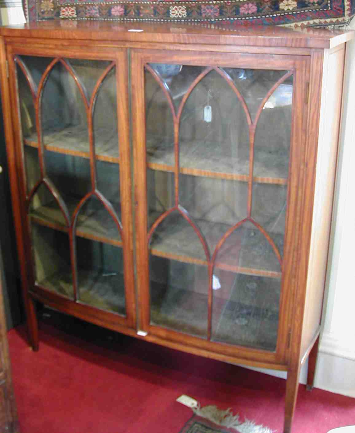 with shallow bowfront, the crossbanded top above pair of astragal glazed doors enclosing velvet lined shelved interior, on square section tapered legs, bears label of Druce & Co., Baker Street, London