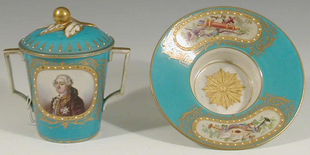 the lid with leaf and berry finial, the cup with opposed painted oval panels depicting portrait medallions of 18th century French monarchs, within jewelled borders, on a turquoise and gilt ground,the stand with two kidney shaped jewelled musical cartouche panels, blue painted entrelac mark and letter 'L'