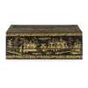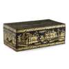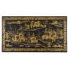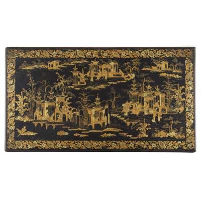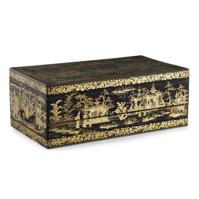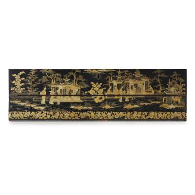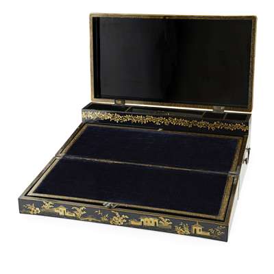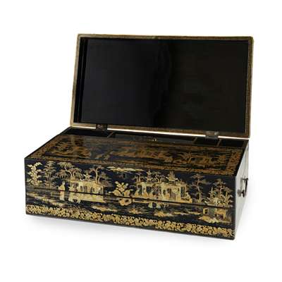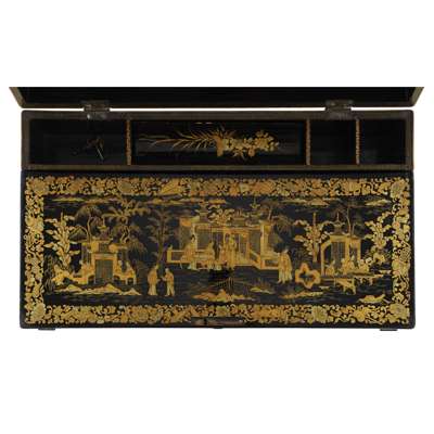 the exterior finely lacquered with characteristic scenes of Chinese figures engaged in leisurely activities in pavilions and on lakeside terraces, fitted with a folding plush slope before a compartmented interior with hidden drawers