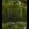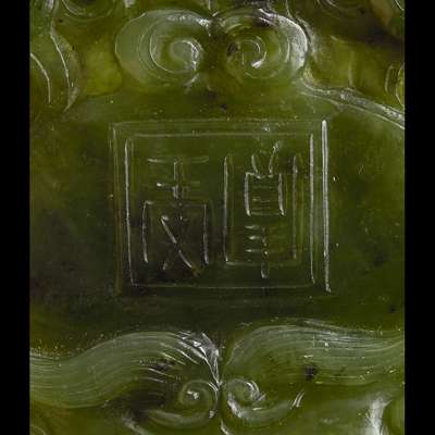 carved utilising the natural dark brown inclusions of the stone with a cicada and a bat perched on a gnarled branch issuing a double-gourd and lingzhi; together with a SPINACH-GREEN JADE 'DRAGON' BELT BUCKLE, 20TH CENTURY (2)