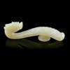 with the horned head forming the hook, facing the arched shaft carved in low relief with a symmetrical design of archaistic scrolls, the reverse of the shaft with a circular knob, the stone with a light celadon tone
