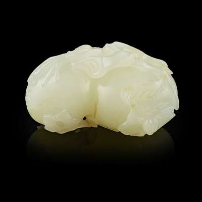 carved in the form of two large ripening fruits attached to a leafy gnarled stalk, the stone of even pale celadon colour with russet highlights