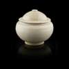 the rounded sides rising from a short straight foot, the exterior covered overall in a creamy-white glaze falling short of the foot to reveal the buff body, the domed lotus cover with broad everted rim and surmounted by a short knop, the interior covered in a mottled black and brown glaze