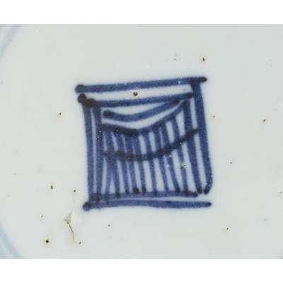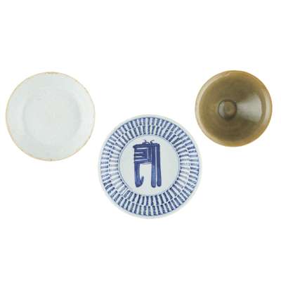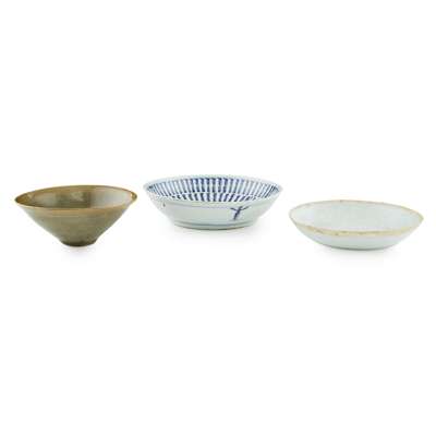 rising sharply from a short foot to widely flared sides, covered overall except for the foot rim with an olive-green glaze; together with a BLUE AND WHITE 'LANÇA' DISH, QING DYNASTY, 18TH/19TH CENTURY; and a QINGBAI MOULDED 'PHOENIX' DISH, YUAN DYNASTY (3)