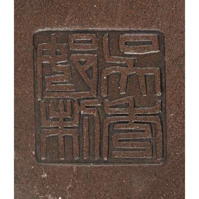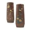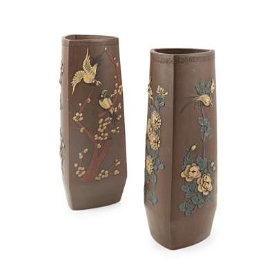 each of triangular section, the exterior with applied 'birds and flowers' decoration below an incised keyfret band at the mouth (2)