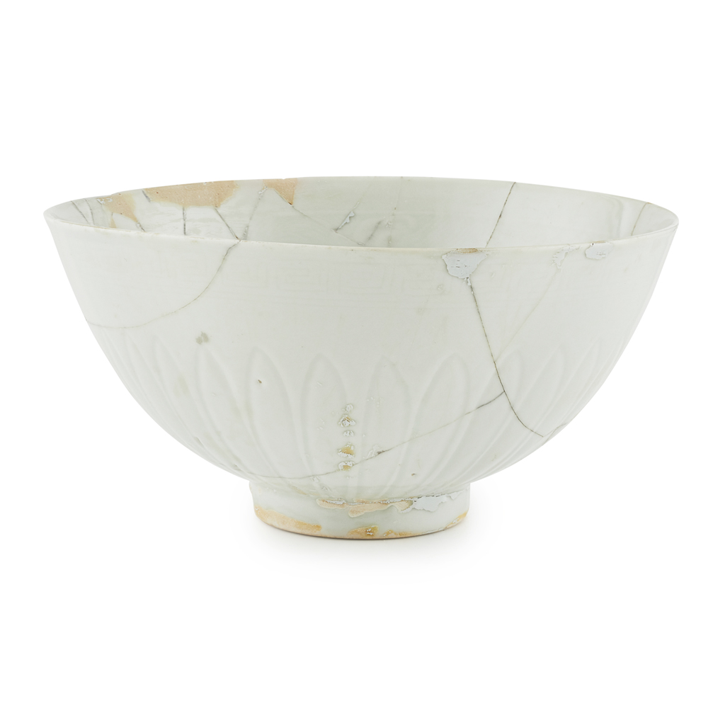 imitating the seed pod of a lotus with the exterior of the bowl decorated with a wide band of lotus petals below a keyfret border at the rim, the interior decorated with a peony scroll in 'secret decoration' (anhua)