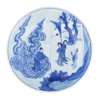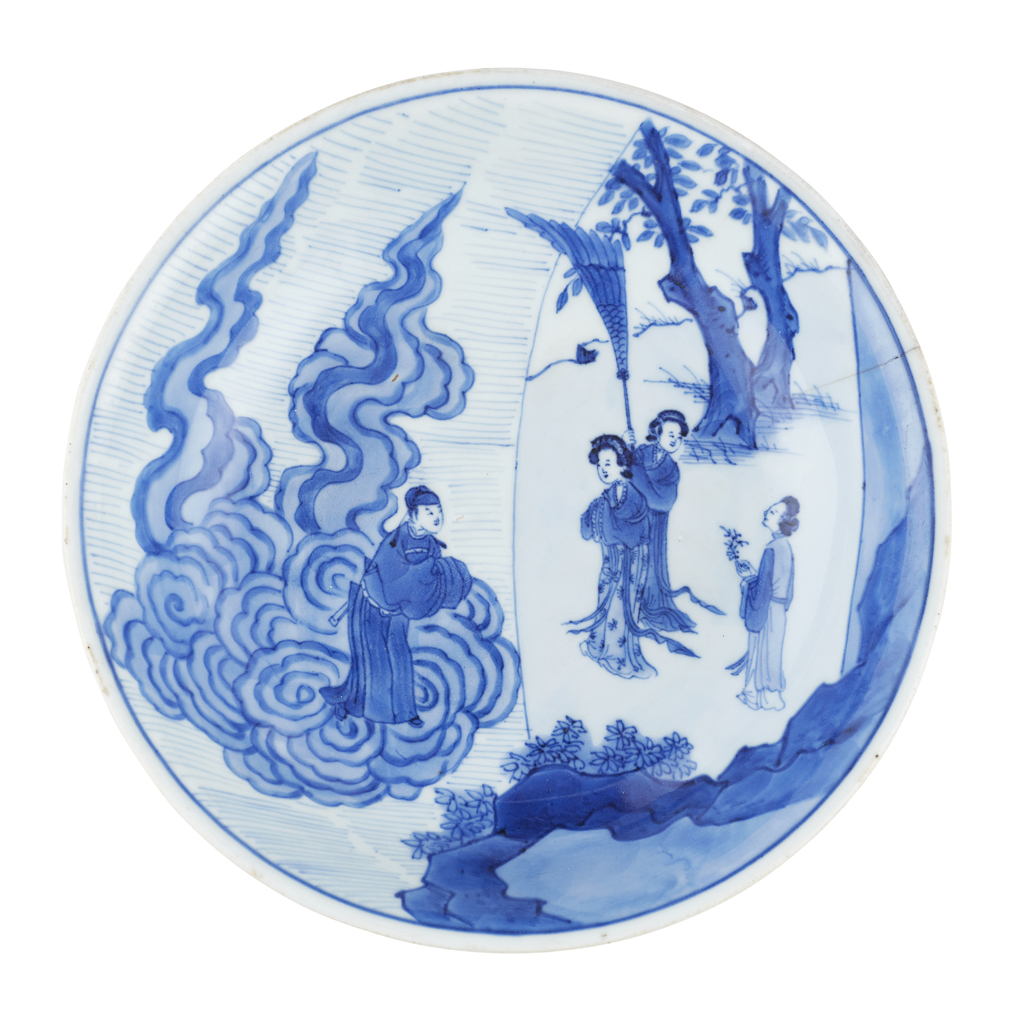the interior finely painted in varying shades of cobalt blue with a young scholar descending on swirling clouds to meet a beauty accompanied by two attendants, the base inscribed with a six-character Kangxi reign mark, surrounded by a mountainous landscape