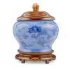 of baluster form, supported on a slightly splayed foot, painted in underglaze blue on a blue ground with a four-clawed dragon, the base inscribed with a six-character Chenghua reign mark in underglaze blue within double rings, the later wooden cover surmounted by a cluster of lingzhi carved in agate, with wooden stand