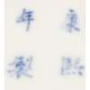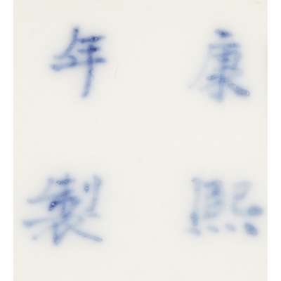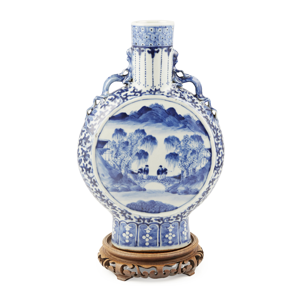 painted with two identical scenes of two scholars meeting on a bridge in a mountainous landscape, the shoulder moulded with a pair of chilong dragons, the base with an apocryphal Kangxi mark