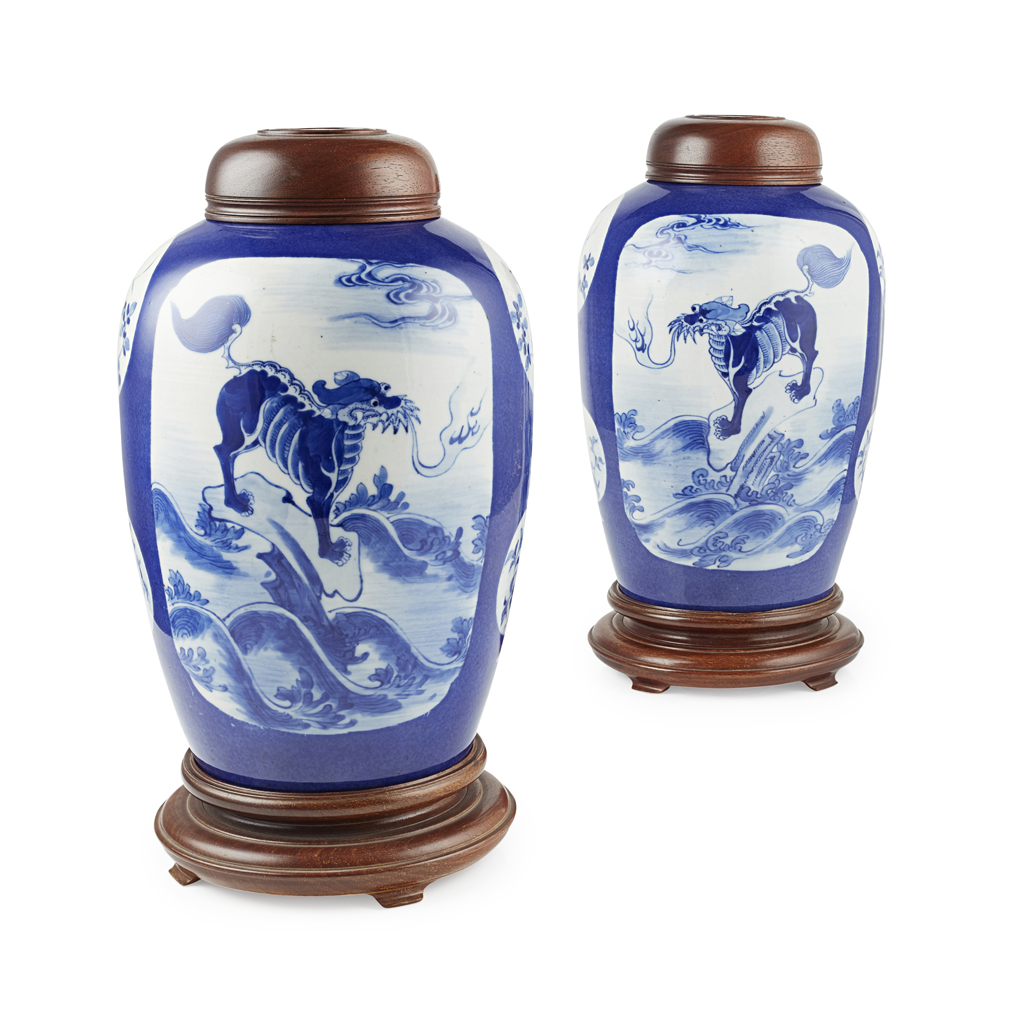 PAIR OF OVOID BLUE-GROUND JARS AND WOODEN COVERS