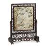 depicting various species of birds including ducks, pheasants and swallows amongst pine trees and flowering peonies, inserted into a reticulated wooden table screen supported on Buddhist lion feet