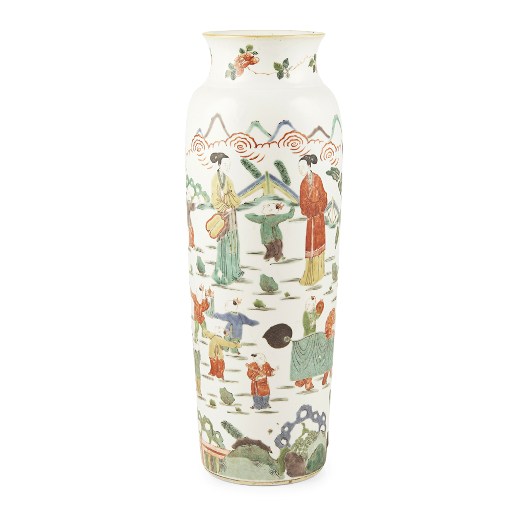the cylindrical form rising to a waisted neck and slightly everted rim, painted with a continuous scene of boys at play, the children depicted in animated groups lighting firecrackers, playing music and dancing, whilst three ladies watch with amusement