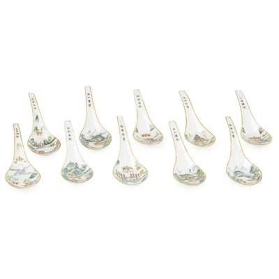 delicately painted with ten different landscape views, with inscriptions in black enamel to identify the sites, each spoon with a four-character iron-red Tongzhi seal mark within double squares (10)