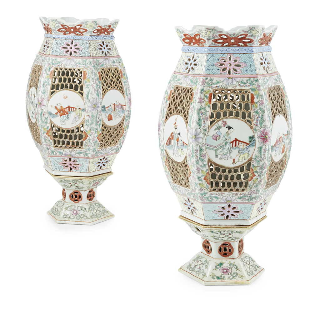 PAIR OF FAMILLE ROSE LANTERNS AND STANDS