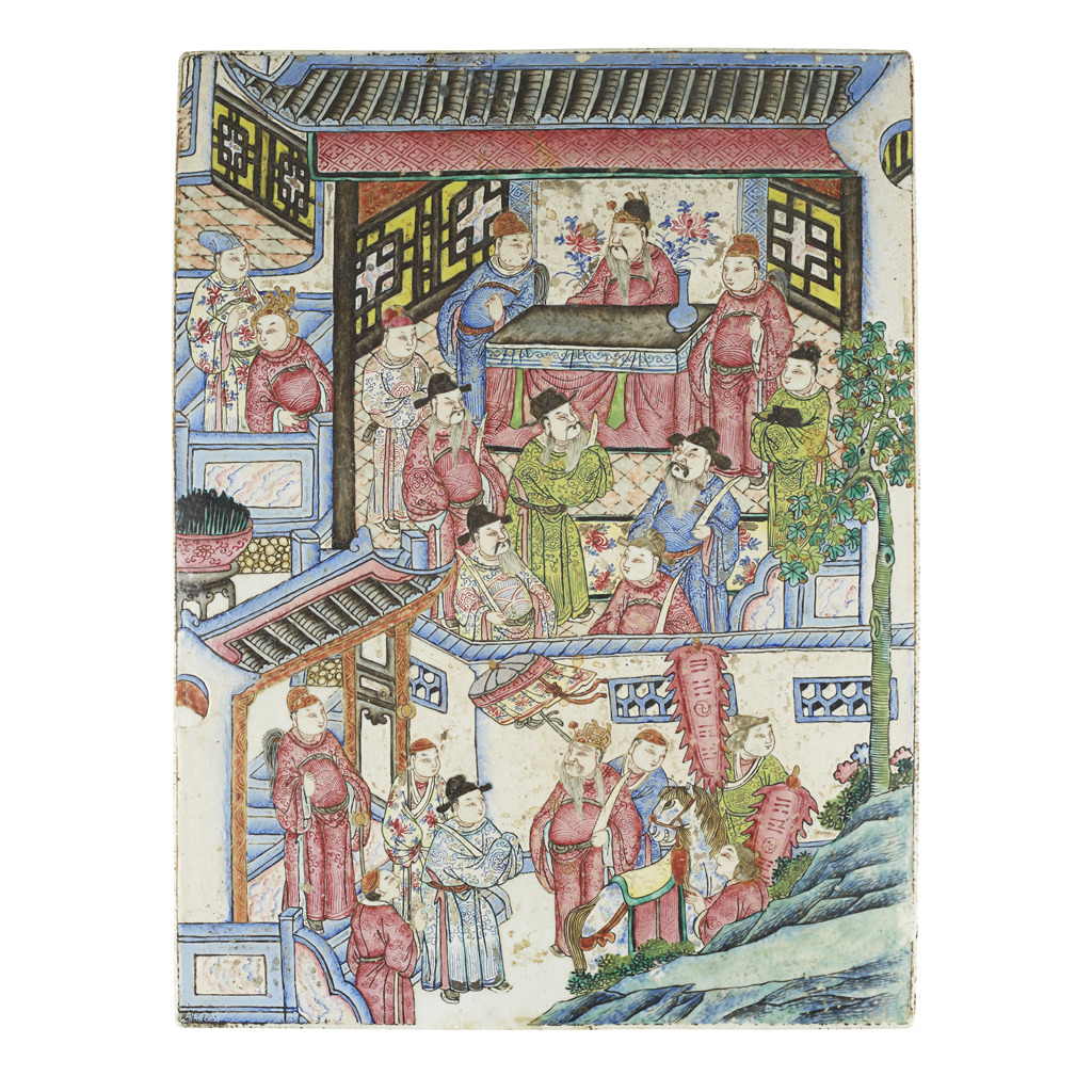 the porcelain plaque painted with a multitude of officials and attendants in an architectural setting rendered in the traditional parallel perspective, mounted on a wooden stand elaborately carved in openwork with dragons and phoenix amongst ruyi clouds