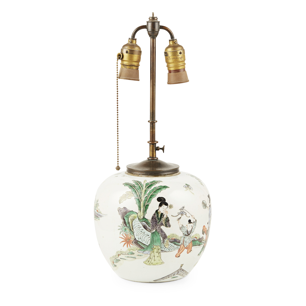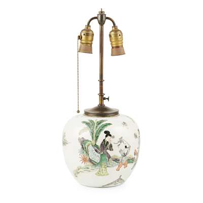 painted with a group of ladies and boys at leisurely pursuits in a garden, converted into a lamp