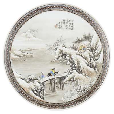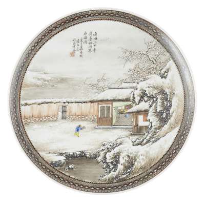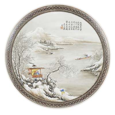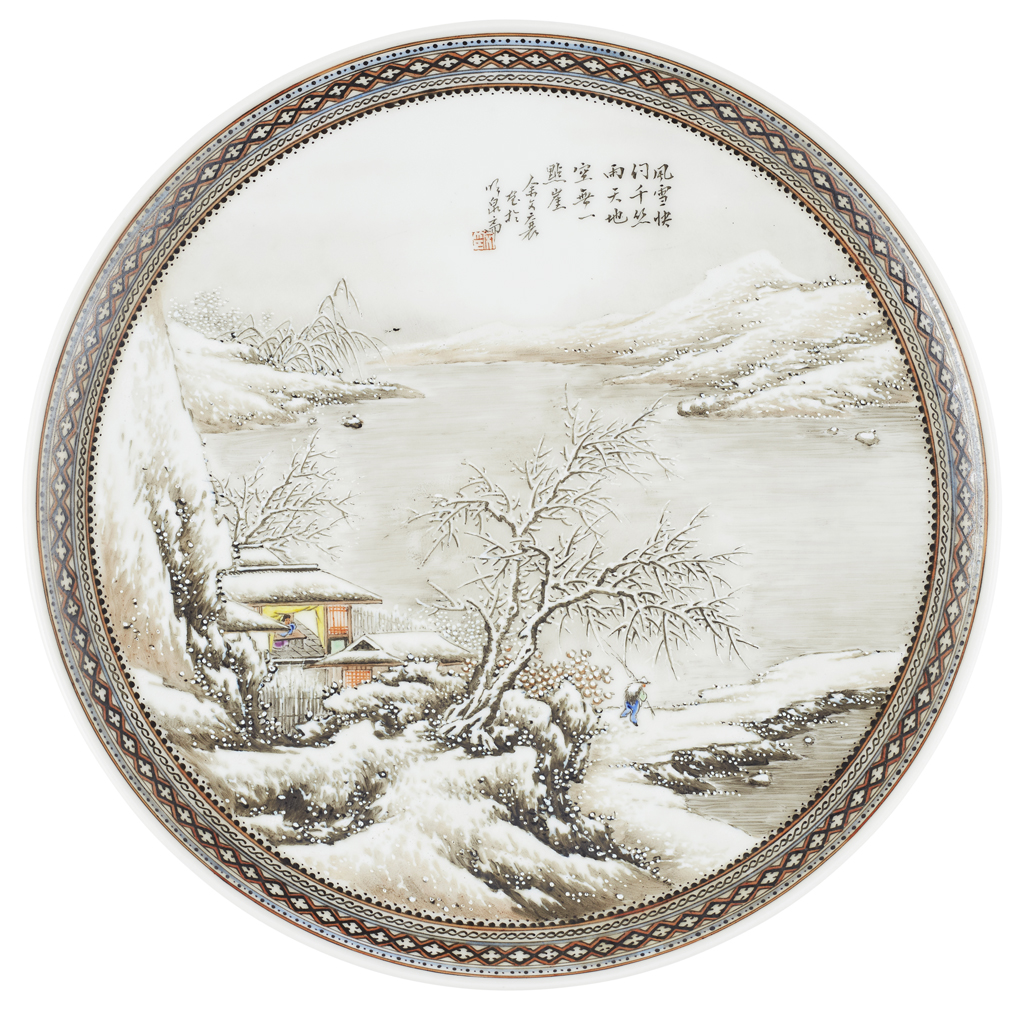 FOUR GRISAILLE AND FAMILLE ROSE 'WINTER LANDSCAPE' DISHES