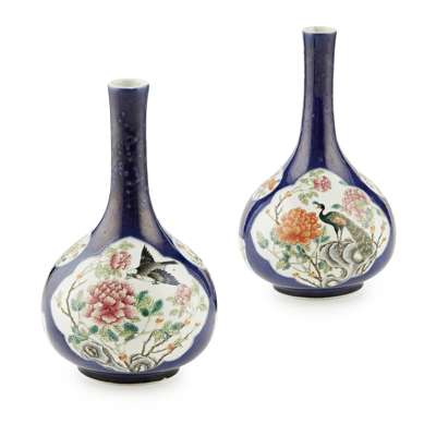 PAIR OF FAMILLE VERTE BLUE GROUND BOTTLE VASES