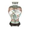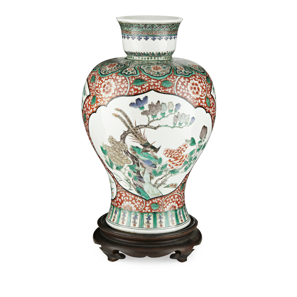 decorated with two large lobed panels depicting a peacock and a pheasant perched on rockwork, reserved on a red-enamelled ground with dense scrolling foliage