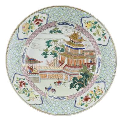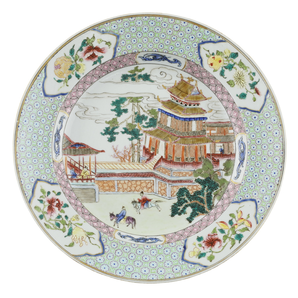 of circular form, enamelled with figures engaged in leisurely pursuits in a palatial complex, the outer rim decorated with a green diaper border interrupted by four reserves enclosing flowering and fruiting branches