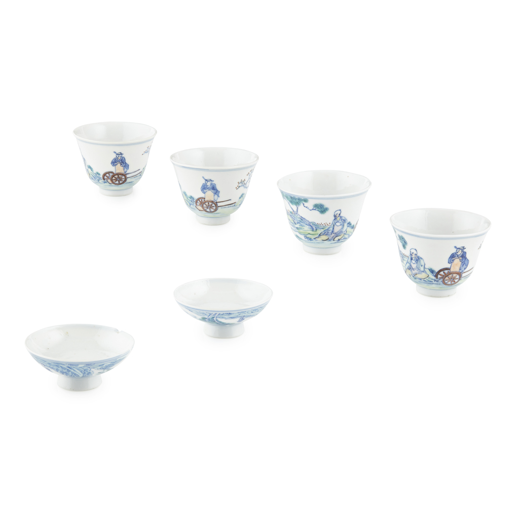 each cup painted with a scholar resting under a pine tree, accompanied by an attendant, the two covers each painted with a miniature figure in a landscape, each item inscribed with an underglaze-blue Chen Ding Xuan mark (6)