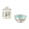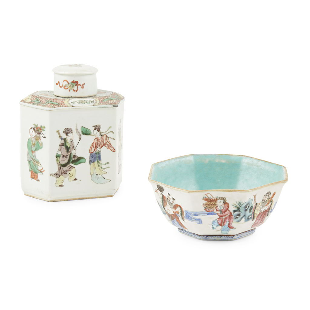 of hexagonal section, well painted on the exterior with the Eight Immortals each holding his attribute, the lid decorated with a boy holding a lotus flower; together with a FAMILLE VERTE OCTAGONAL 'EIGHT IMMORTALS' BOWL, TONGZHI MARK, LATE QING DYNASTY (2)