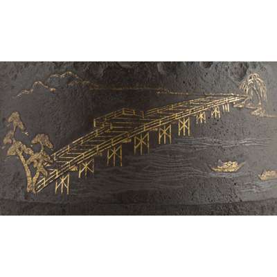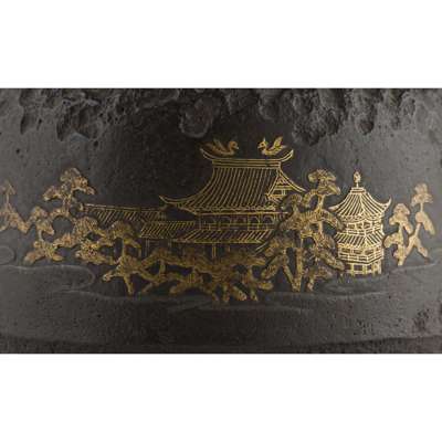 of cylindrical form, the iron body finished in a rough stone-like texture and inlaid in gold nunome-zogan in typical Komai-style with famous landmarks of Kyoto including the Byodo-in Temple with a pair of phoenix stretching their wings upon the roof, and the Sanjo Ohashi bridge spanning the Kamo River, the cover inlaid with a mountainous landscape vignette, the overhead handle inlaid with three small birds flying towards a crescent moon, with an inlaid gold mark reading Seigyokudo (Hall of Clear Jade) within a lobed reserve to the side