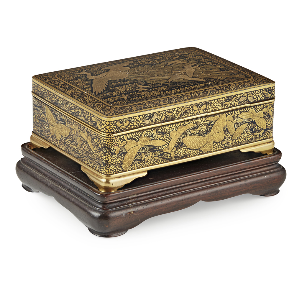 finely worked throughout in the typical Komai style of predominately gold overlay, the cover decorated with a large peacock flying beside smaller birds, the sides decorated with butterflies amongst foliage, the interior well engraved with a dragon leaping amongst waves and four wild geese, signed on the base with a seal 'Nihon koku Kyoto no ju Komai sei' (Made by Komai of Kyoto, Japan) beside a bird perched on trailing wisteria