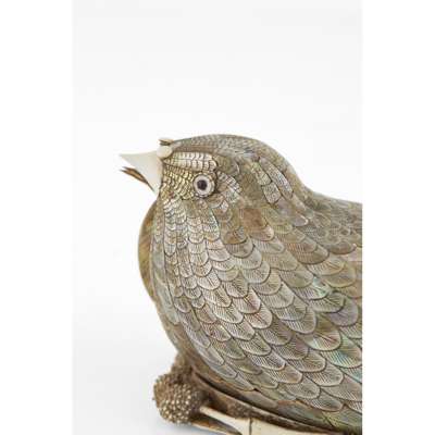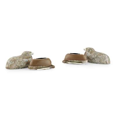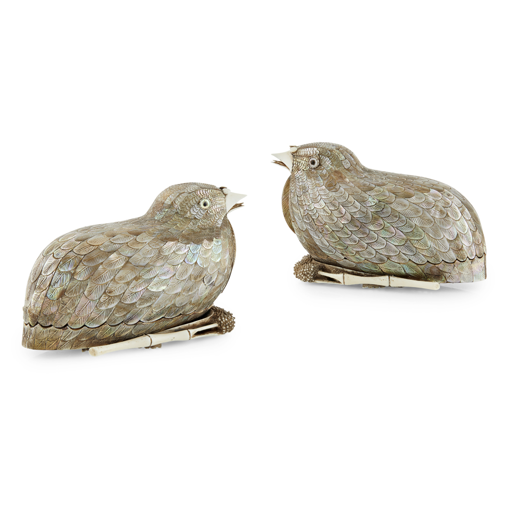 each box and cover finely modelled in the form of a recumbent quail, intricately inlaid with mother-of-pearl feathers, the carved ivory feet tucked underneath next to a branch of millet (2)