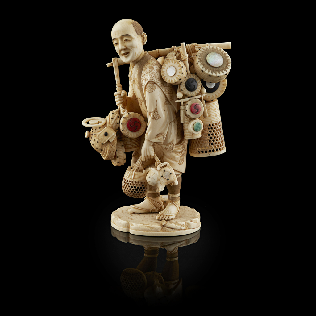 INLAID IVORY OKIMONO OF A BASKET MERCHANT Y