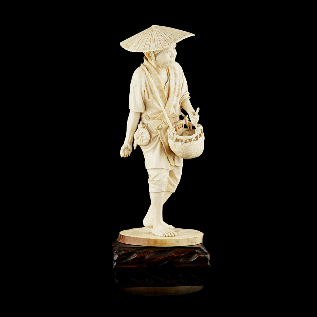 the farmer wearing a large straw hat and carrying a basket filled with rice, his right hand holding a palm full of rice, possibly about to feed his poultry