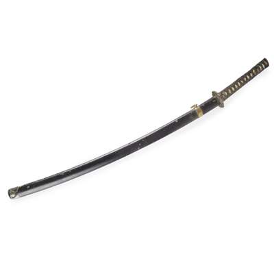 with white ray skin grip covered in black silk cord, with gilt metal menuki and pommel, fine tsuba with raised and gilt flower heads, the slightly curved blade with curly hamon fuller running the length of the blade, the double rivet hole tang signed on both surfaces Bizan Osafune Sukemitsu and dated the sixth year of Muromachi period (1509), black lacquer scabbard with single suspension ring
