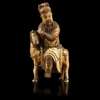 Guandi shown seated astride a horse with full trappings, wearing a suit of armour beneath flowing robes and an official's cap
