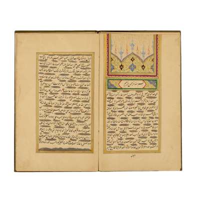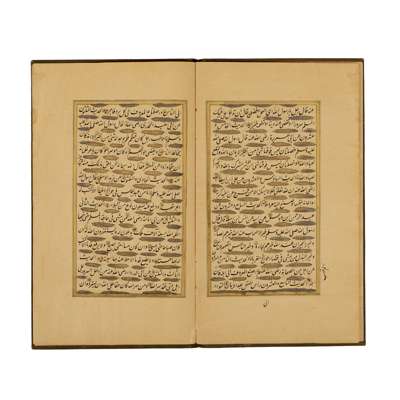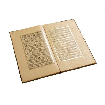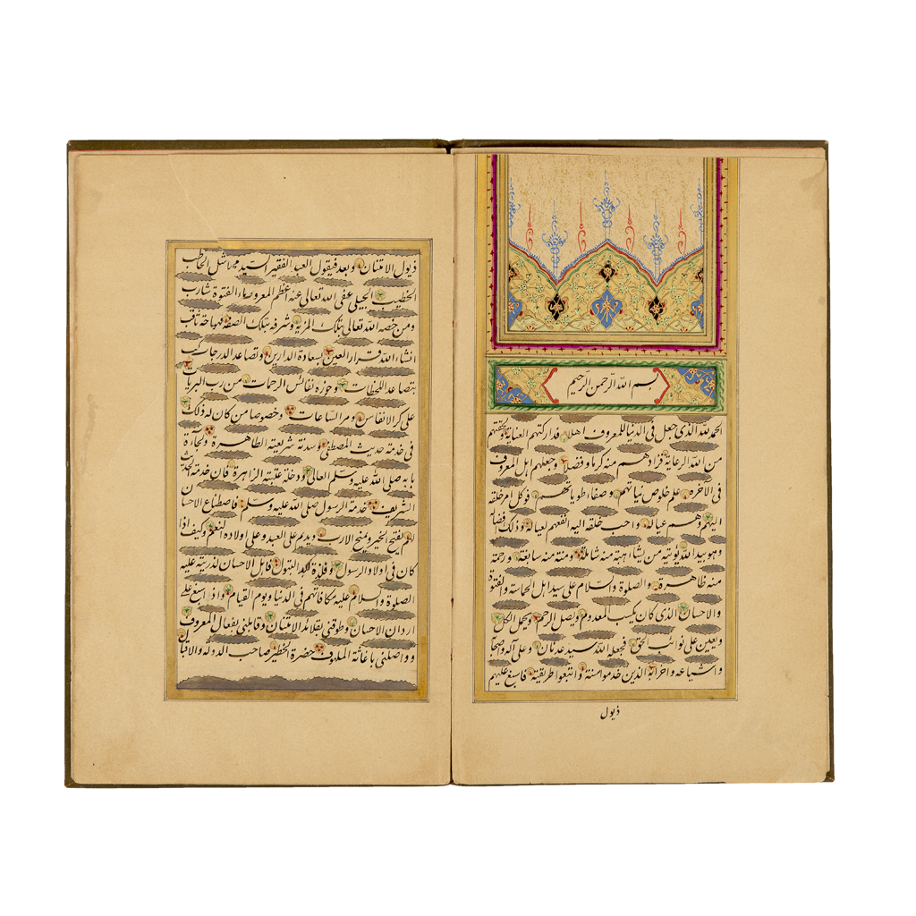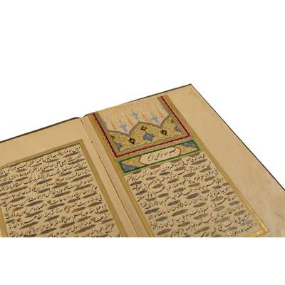 black ink and gold on cream paper, illuminated and polychrome heading decorated with floral and geometric designs, nine leaves, fourteen lines to the page written in naskh script illuminated with elegant cloud scrolls, gold and polychrome roundels separating text, each page within a single gold margin, in a palace gilt leather binding with tughra of Abdul Hamid II