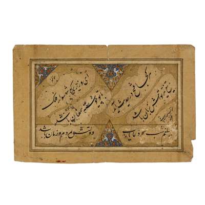 black ink and gold on paper laid down on card, the upper register with one elegant line in thuluth script, the lower register with three lines in naskh script, signed lower left; together with an OTTOMON CALLIGRAPHIC PAGE, SIGNED BY ABDUL BAQI, 18TH CENTURY (2)